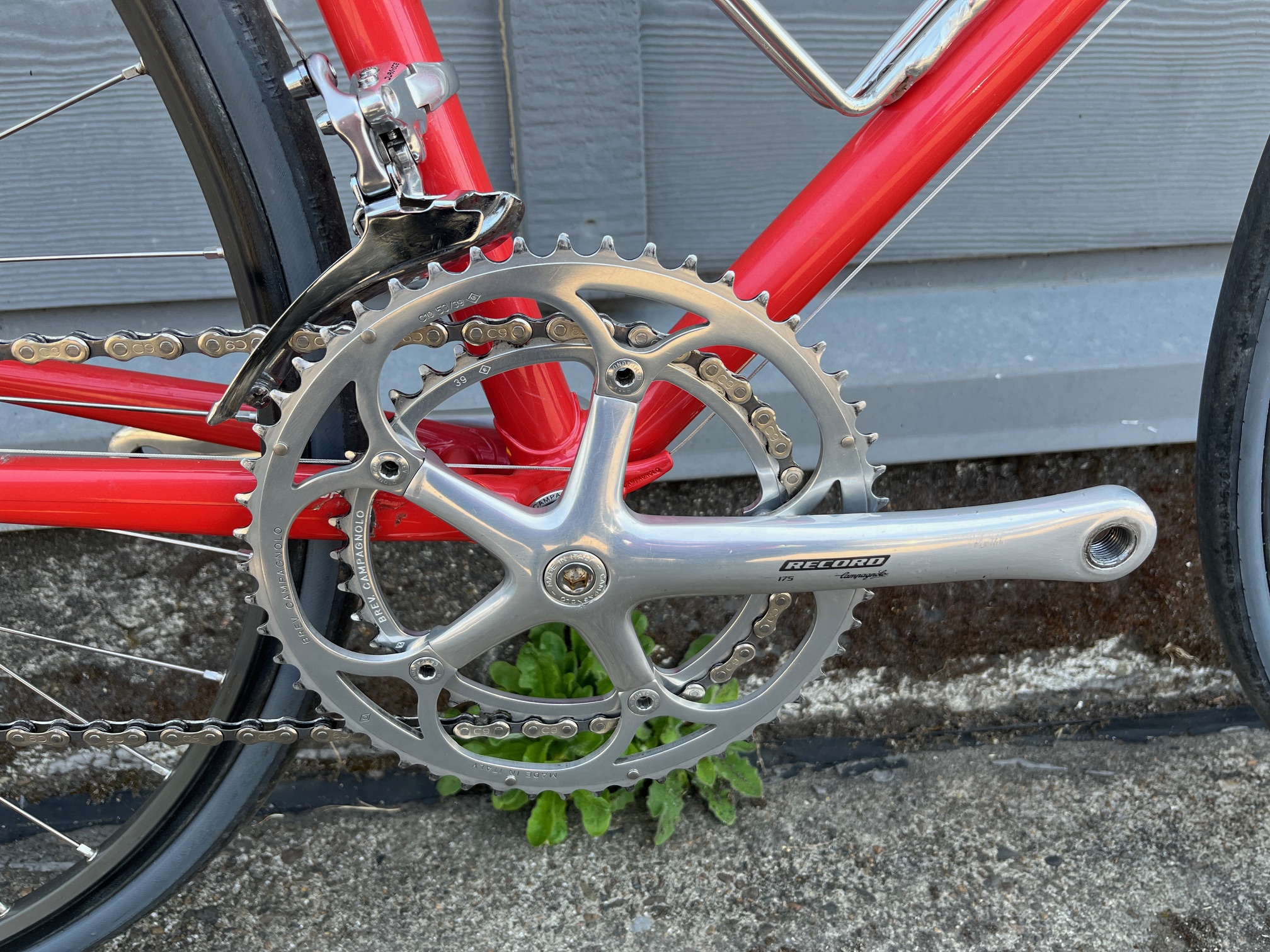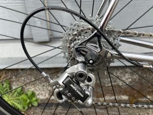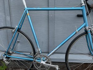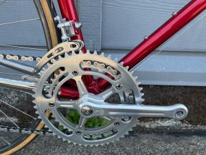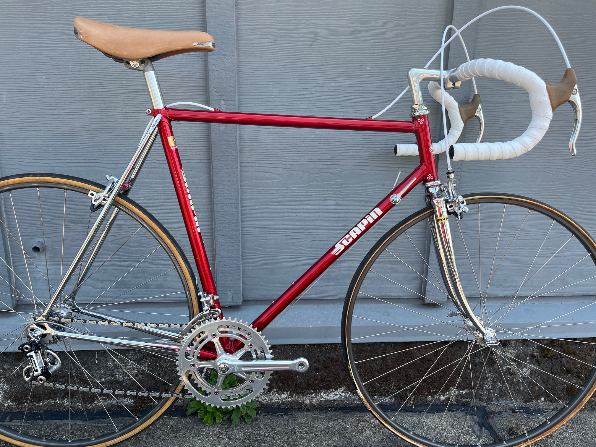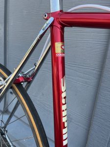 Mid-1980s Scapin. (FOR SALE) Beautiful Italian frameset. Columbus SLX tubing. Lots of chrome: seat stays, chain stays, fork. Campagnolo Super Record 2×6 speed groupset. 56cm seat tube, 56cm top tube (center to center).