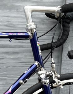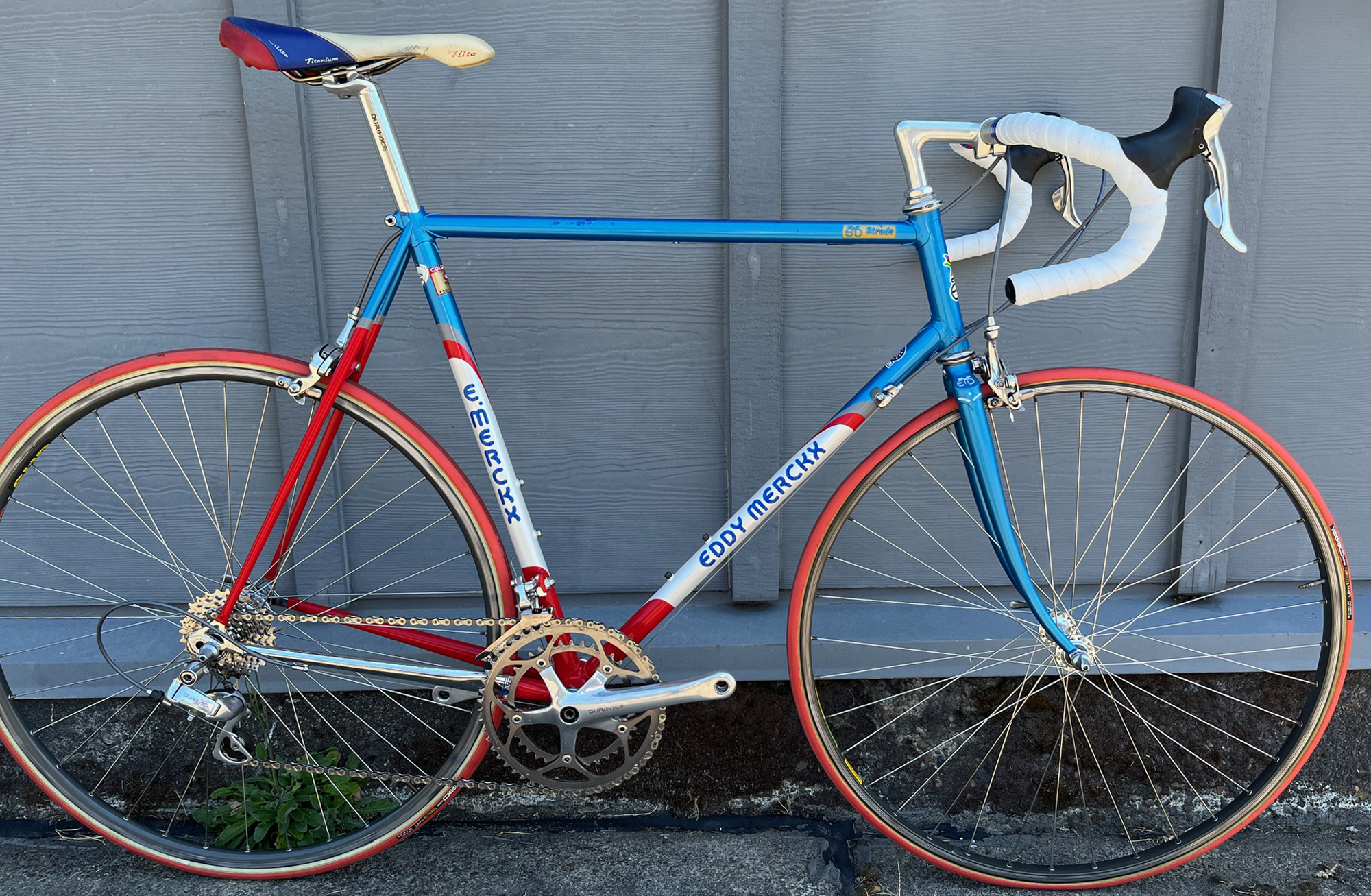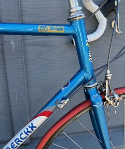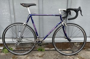 c1993 Eddy Merckx Strada. (FOR SALE) Motorola team colors. Columbus Strada tubing. Shimano Dura Ace 2×9-speed groupset with ergonomic shifters. 57.5cm seat tube, 57cm top tube, center to center).