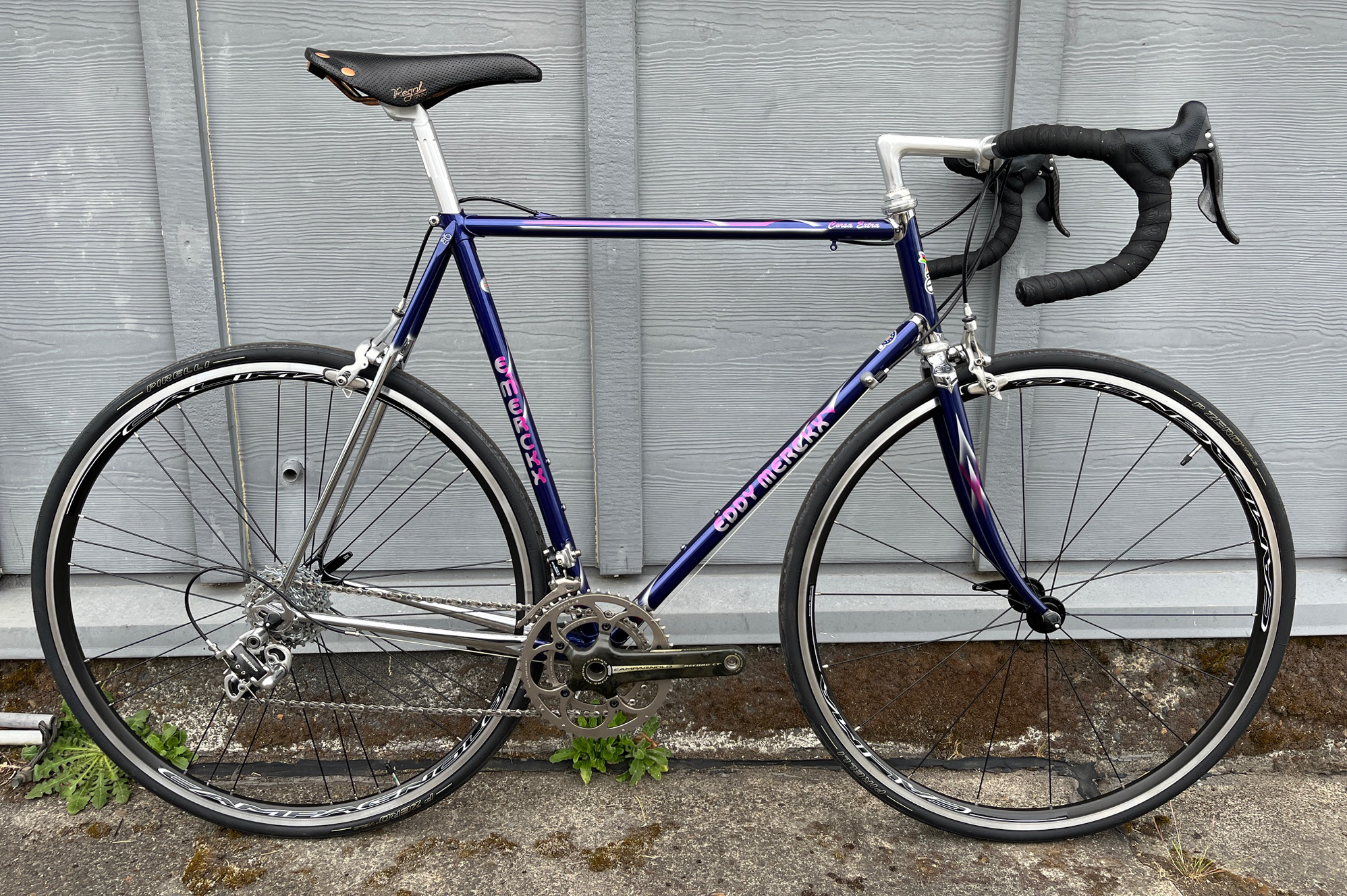 c1993 Eddy Merckx Corsa Extra. (FOR SALE) Believed to be Reynolds 753 tubing. Number plate hanger. Chrome lugs, seat stays, and chain stays. Campagnolo Record 10-Speed groupset. New Campy wheels. 58cm seat tube, 56cm top tube (center to center).